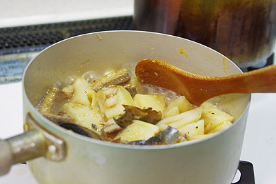 ニシンとタケノコを水の中に酒・みりん・砂糖・味噌を入れ、煮ます。